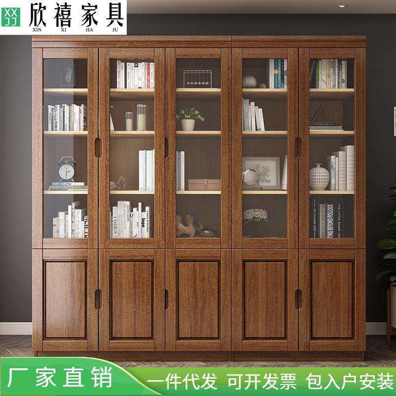 新中式实木书柜黑胡桃书橱组合玻璃柜带门落地靠墙书房家具置物柜