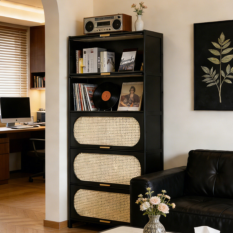 宋式美学书柜带卡座一体靠墙客厅沙发背景墙储物柜藤编门书橱定制