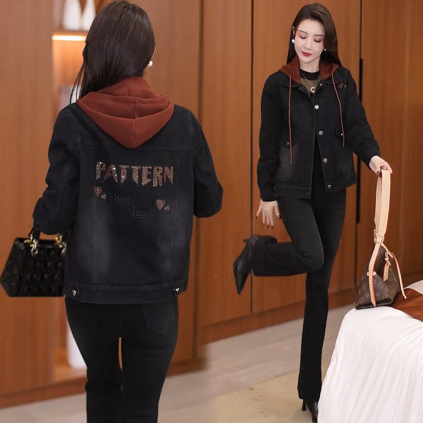 孔雀飞飞冬装韩版大码遮肉复古加绒加厚连帽牛仔外套女款2025新款