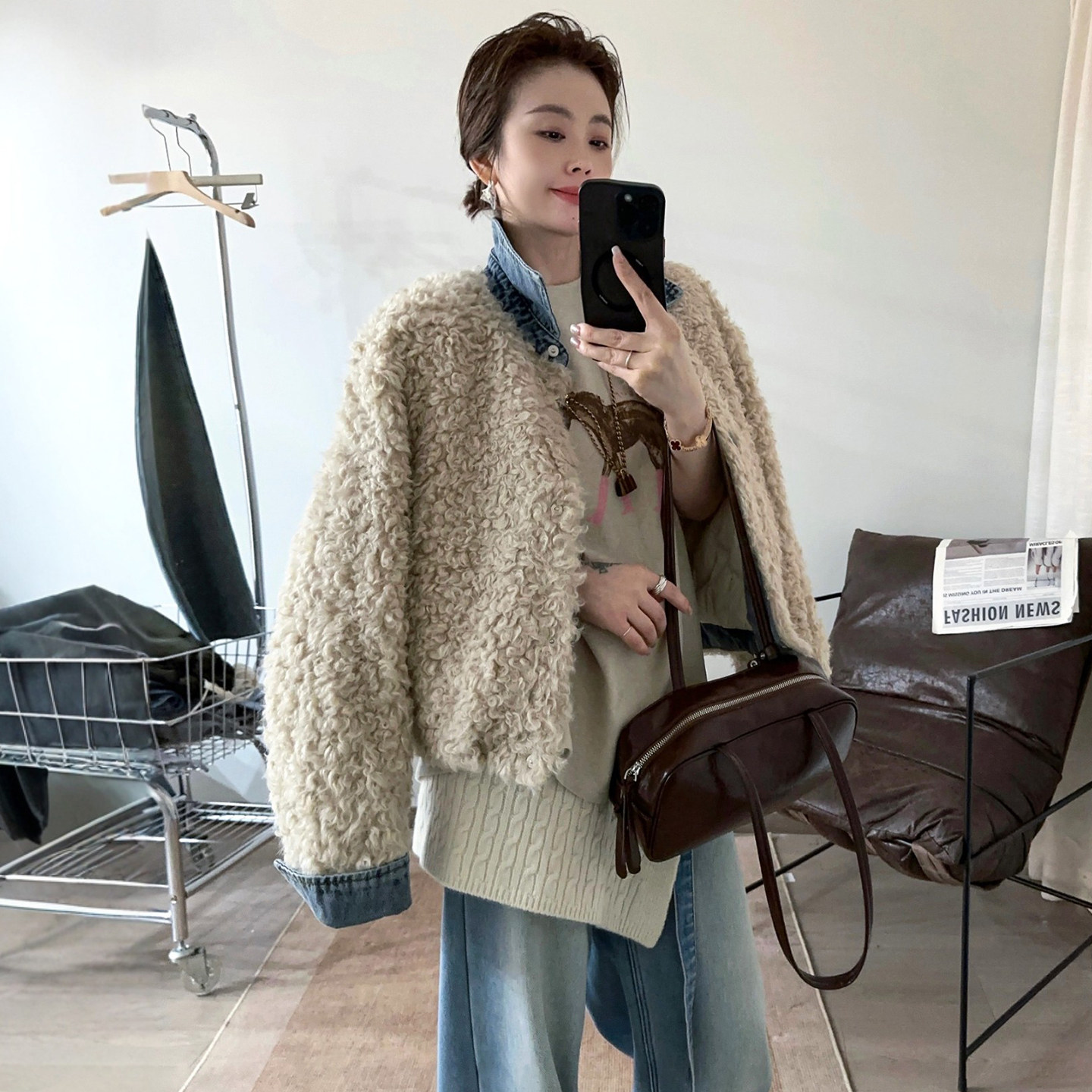 织物猪 摩登少女 复古毛毛拼接牛仔外套女秋冬加绒保暖冬装上衣