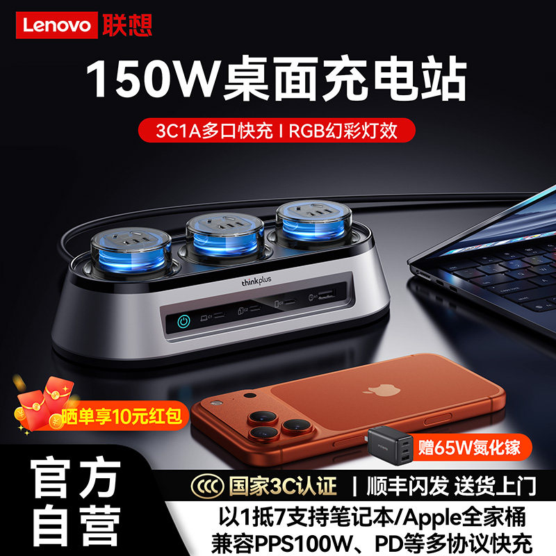【旗舰新品】联想ThinkPlus锋行者氮化镓150W桌面充电站器typec多口排插PD快充适用苹果MacBook笔记本拯救者