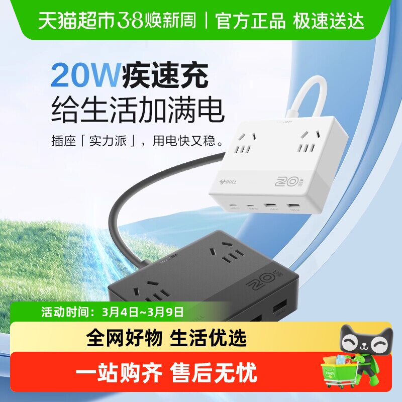 公牛多口充电器多功能USB插头PD20W/30W快充魔方插座多孔插线板排插家用宿舍桌面充电站适用手机/平板通用