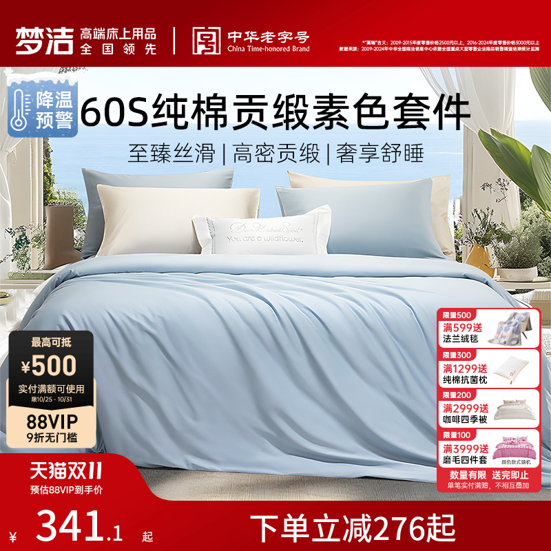 梦洁60S全棉纯棉100三四件套床单被套件枕头轻奢贡缎床上用品