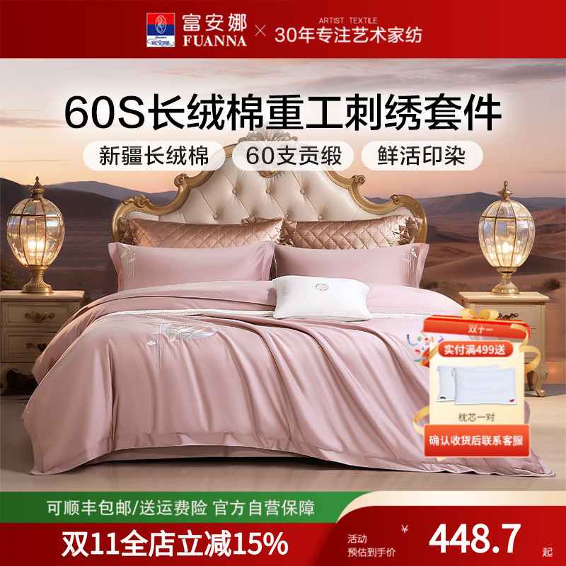 富安娜家纺60支长绒棉四件套纯棉床单被套贡缎床笠轻奢床上用品