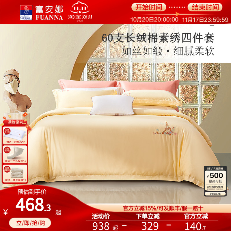 富安娜家纺60支长绒棉四件套全棉纯棉床单被套贡缎床上用品三件套