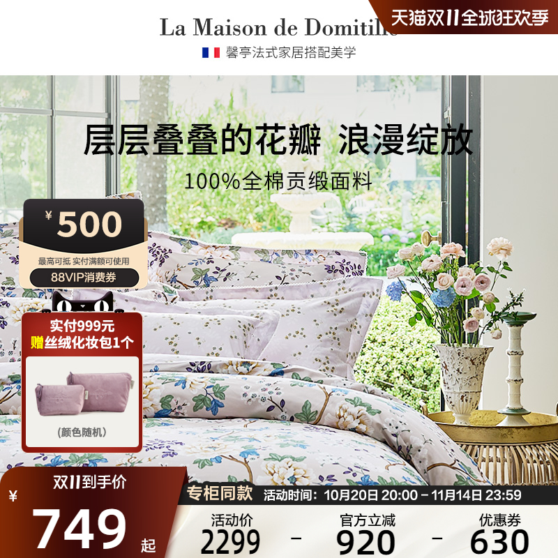 水星家纺60S长绒棉贡缎四件套轻奢纯棉套件花卉被套床单床上用品