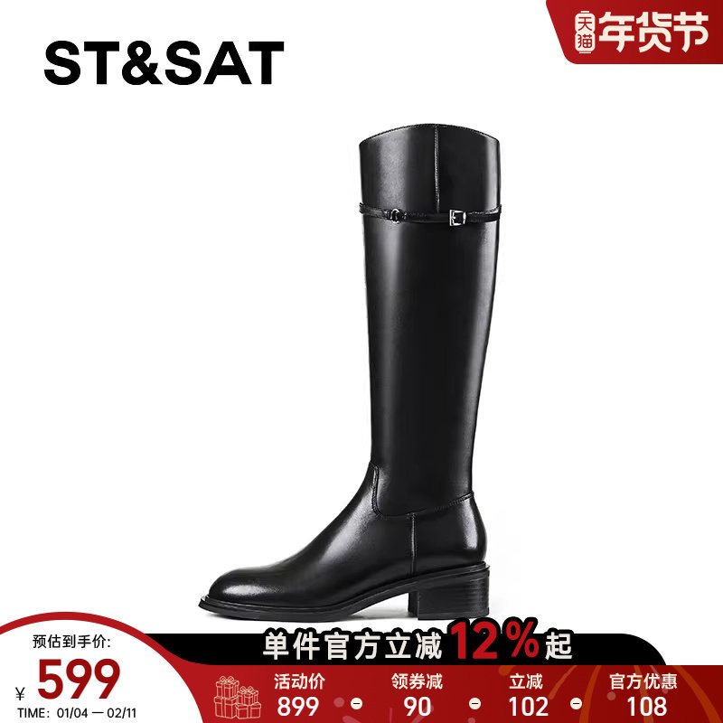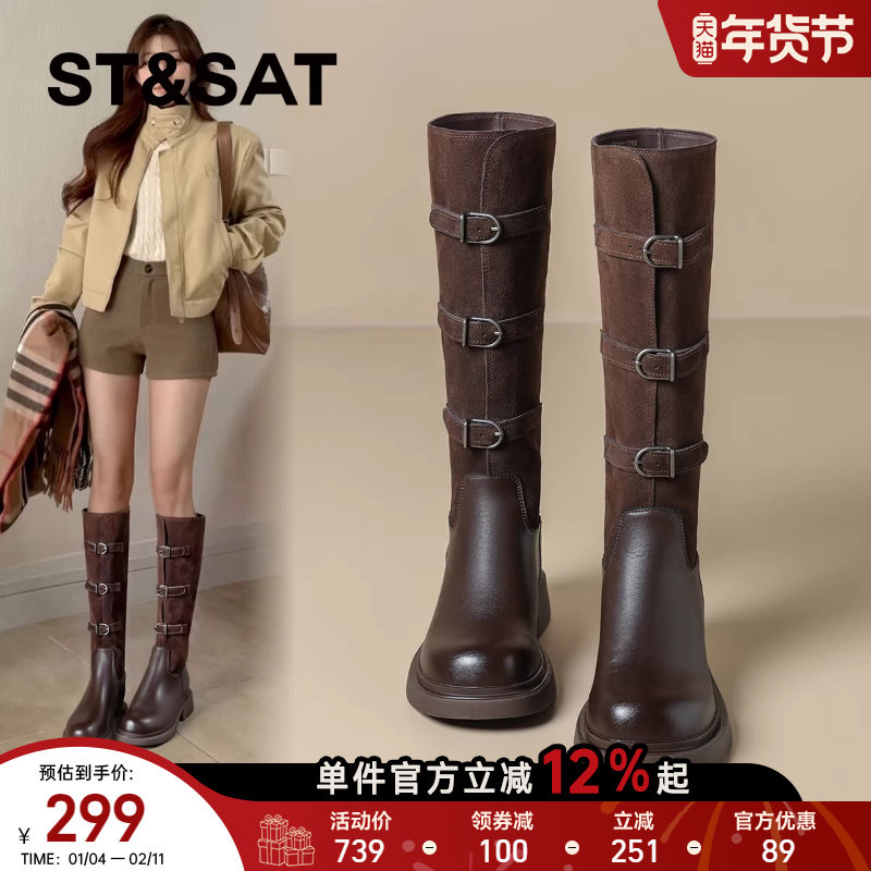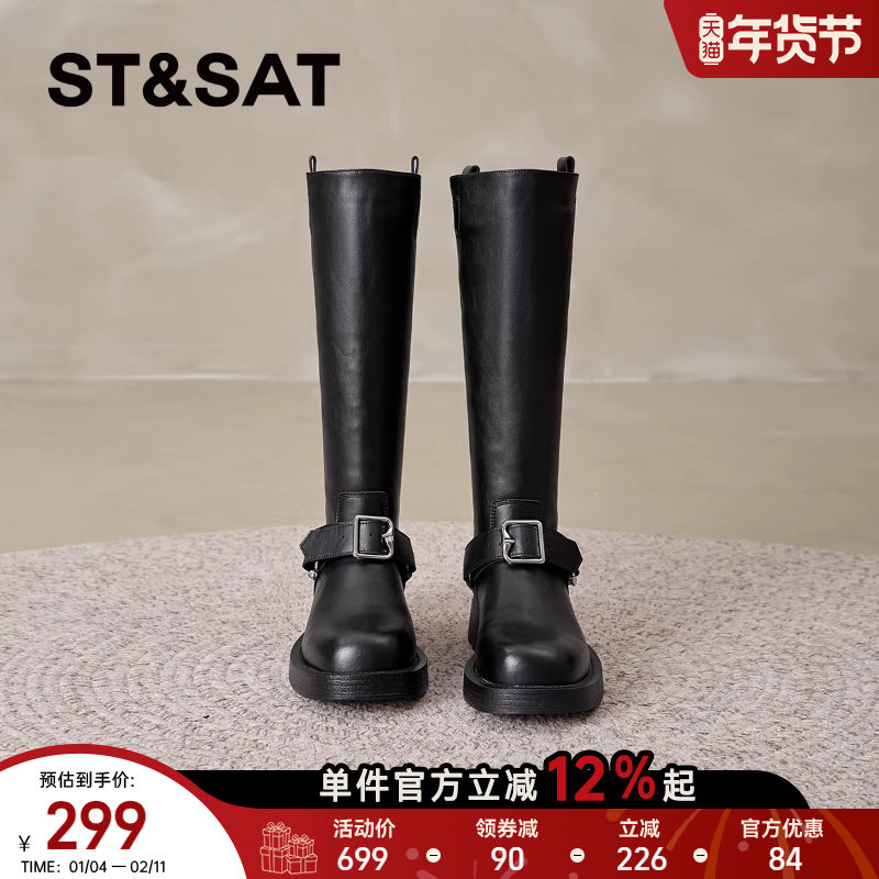 星期六复古真皮骑士靴女靴2025新款显高显瘦靴子皮带扣长筒靴长靴