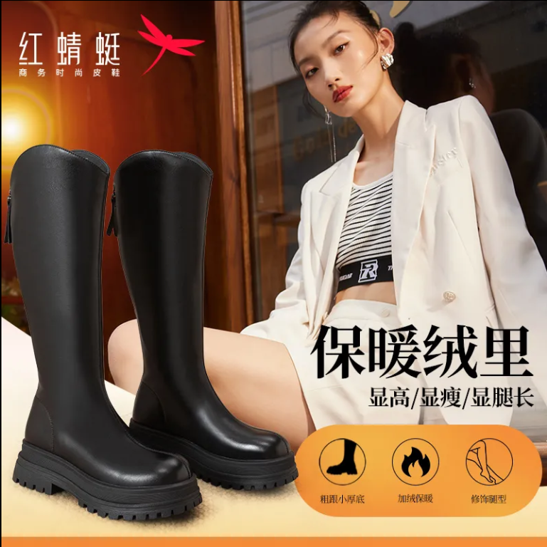 红蜻蜓女靴冬季真皮骑士靴女士加绒保暖增高显瘦长筒靴女断码清仓
