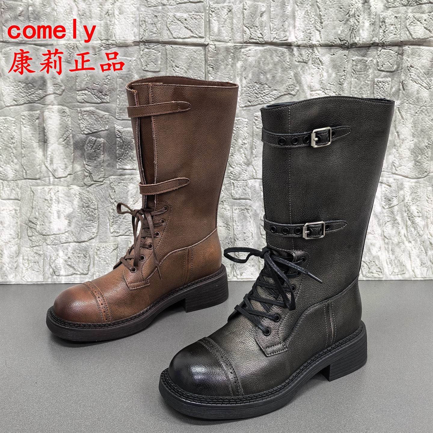 comely康莉正品撤柜真皮骑士靴女冬季中筒机车靴厚底增高西部靴女