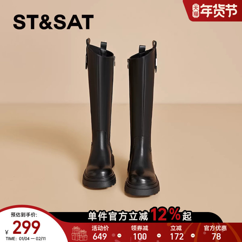 星期六英伦风真皮骑士靴女靴2025秋冬新款粗跟长筒靴机车靴长靴子