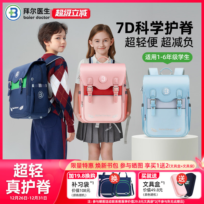 拜尔医生儿童书包女小学生1-3-6年级新款减负护脊轻便双肩包男孩