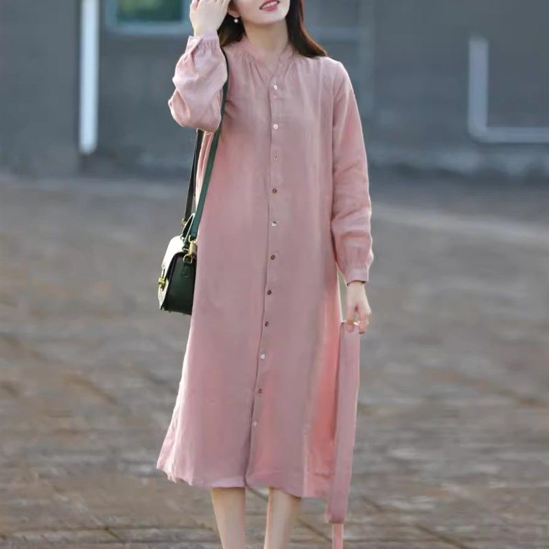 【晚霞暖阳】复古衬衫领长袖连衣裙女2025秋季新款纯色亚麻文艺裙