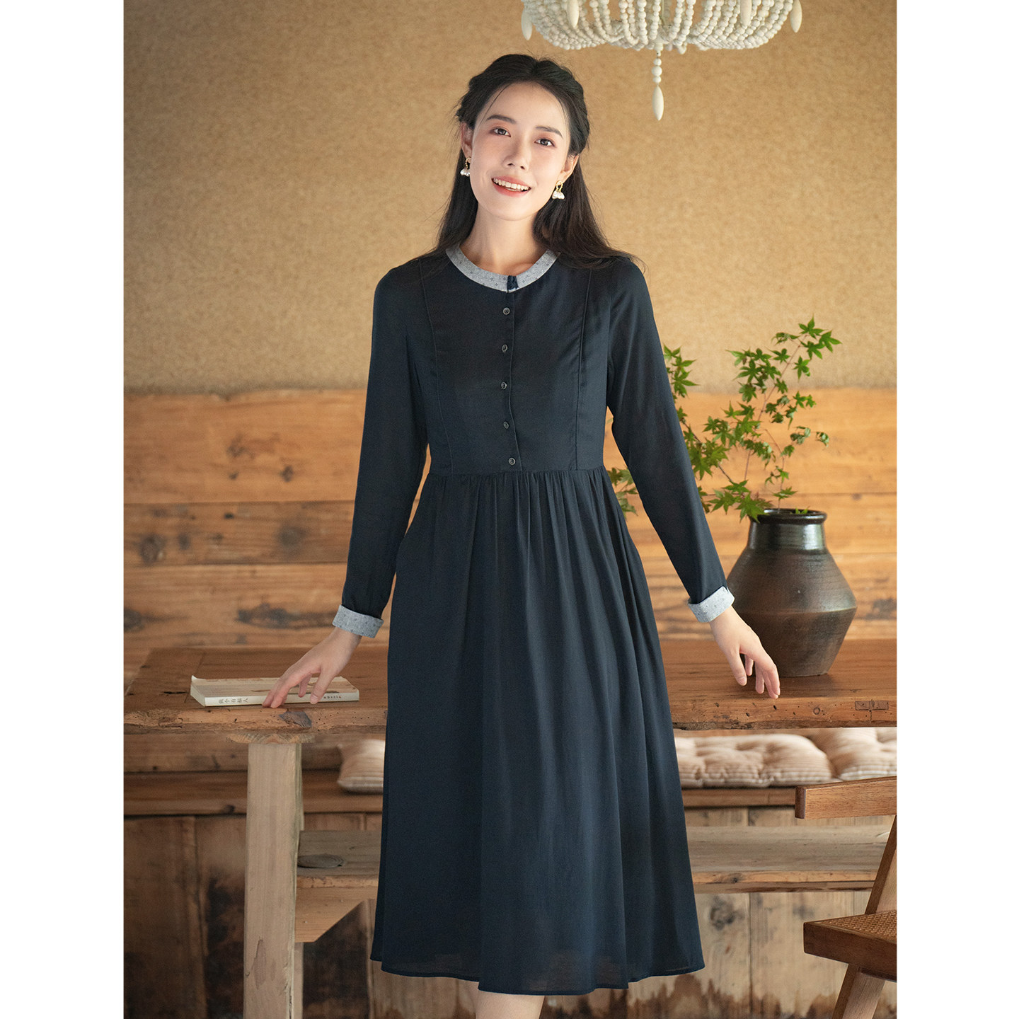 纻衣藏蓝拼接亚麻收腰长袖连衣裙女2025夏秋文艺复古新品修身显瘦