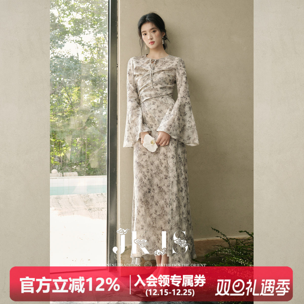 JKJS【韵韶华】人丝亚麻碎花裙 新中式长袖连衣裙日落裙气质长裙