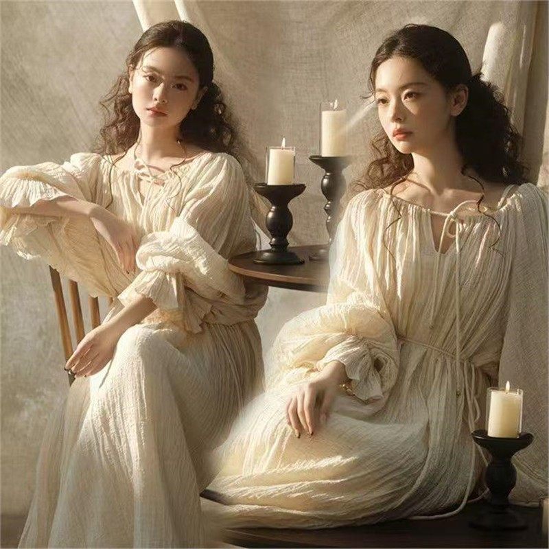 枕梦村庄维多利亚中世纪宫廷欧式复古气质亚麻高腰长袖连衣裙春秋