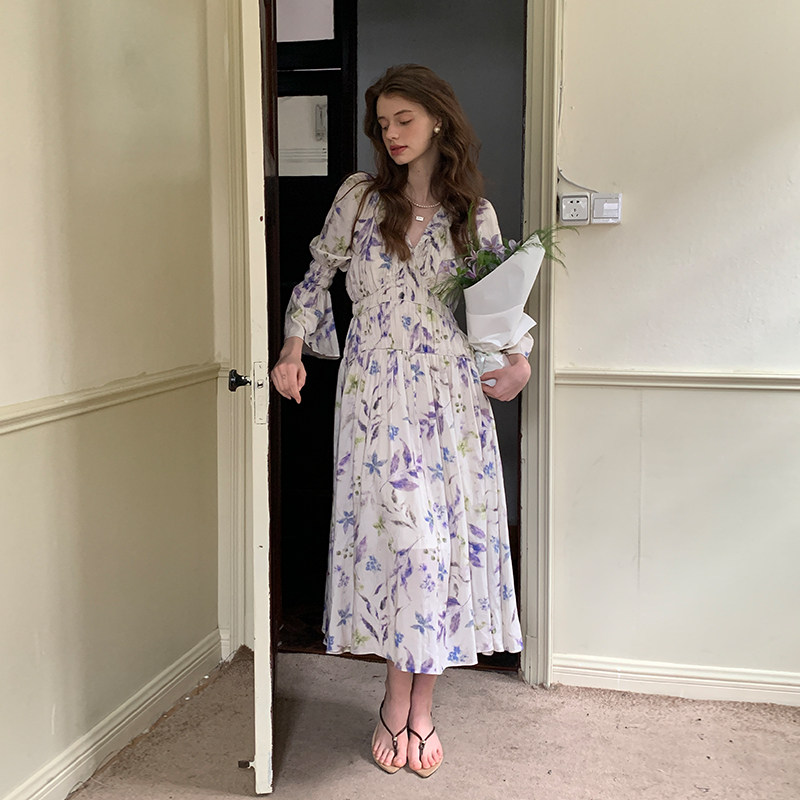 法式复古v领长袖棉麻连衣裙女早春季小众设计亚麻裙子灯笼袖长裙