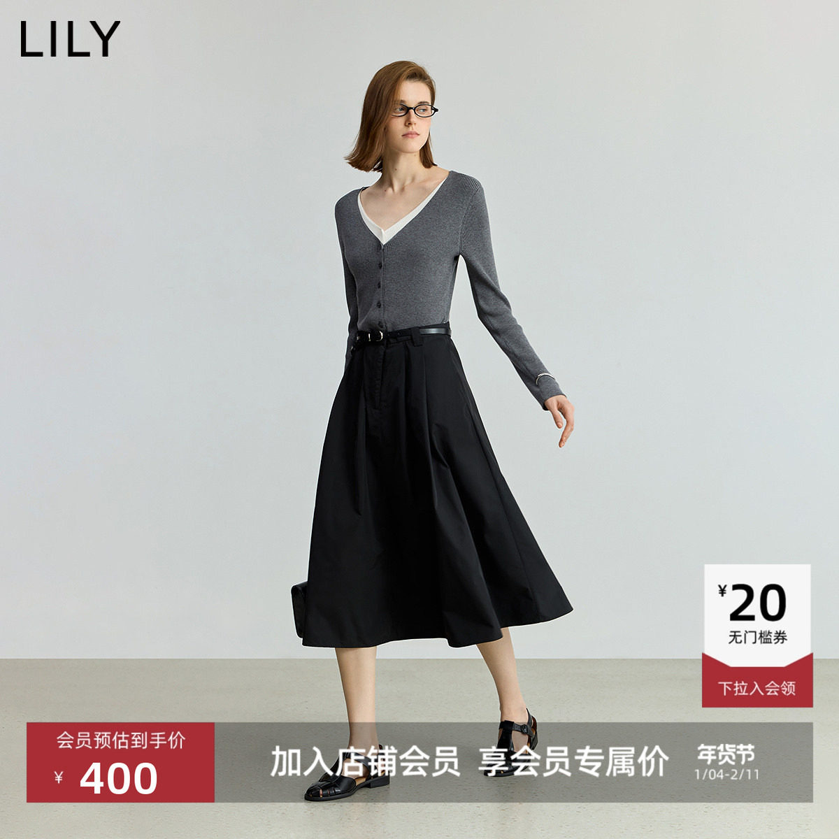 LILY2025新款女装莱赛尔亚麻混纺假两件V领休闲通勤长袖连衣裙