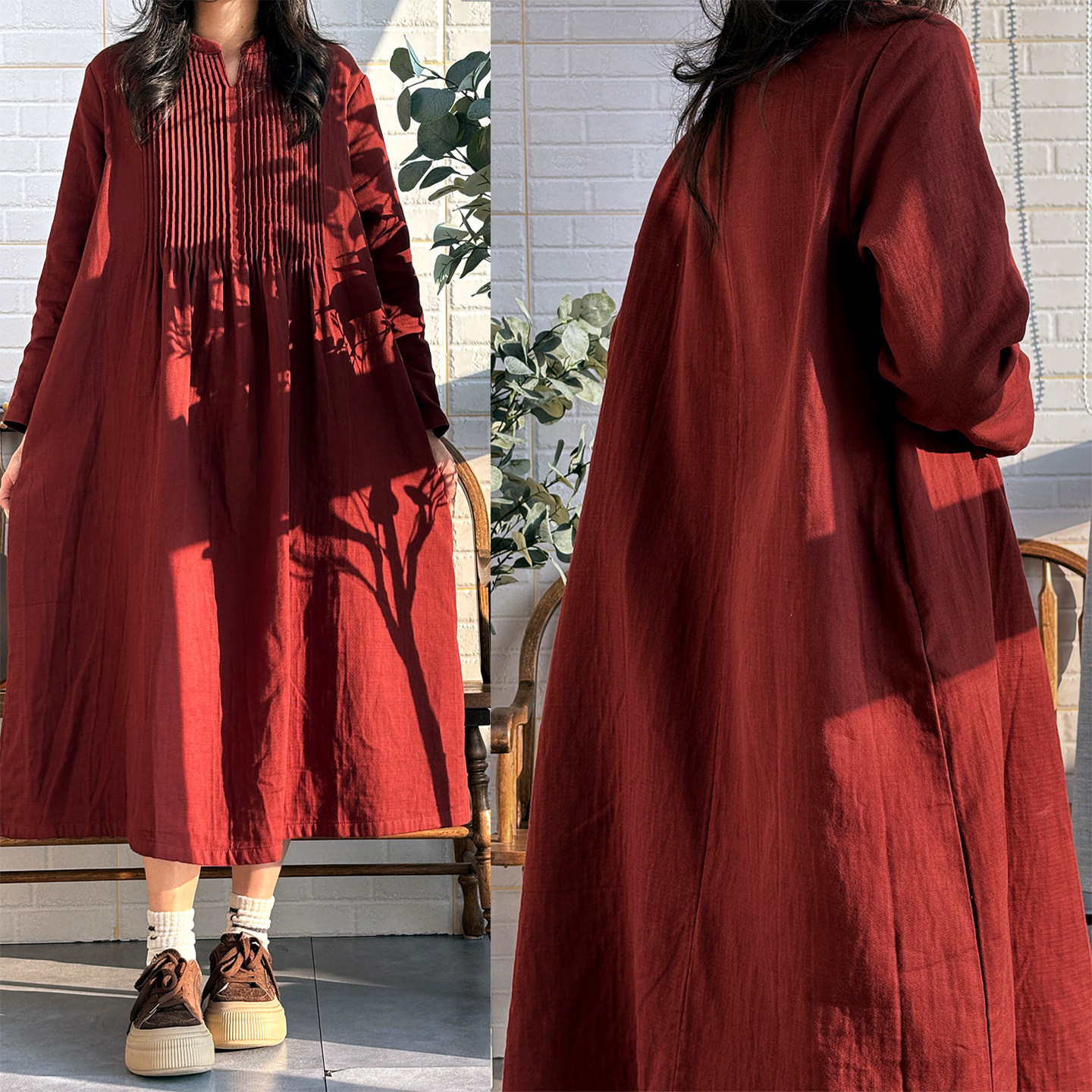 - 红色亚麻长裙