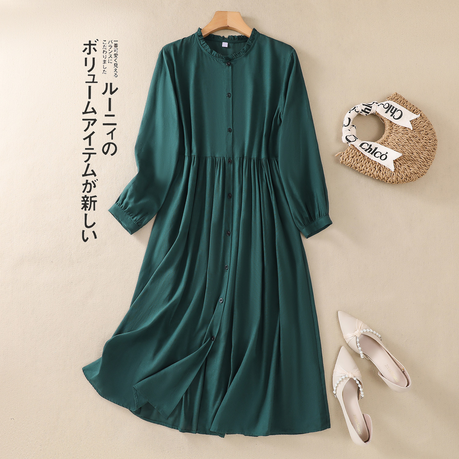 春秋新款亚麻长袖连衣裙全开襟外套裙子宽松文艺女过膝绿色花边领