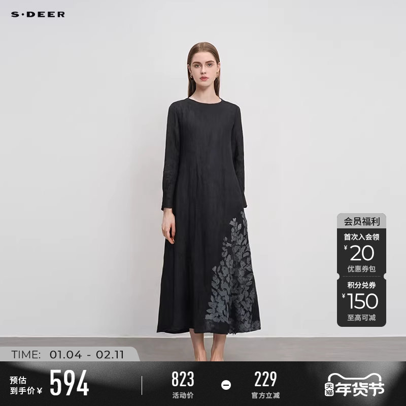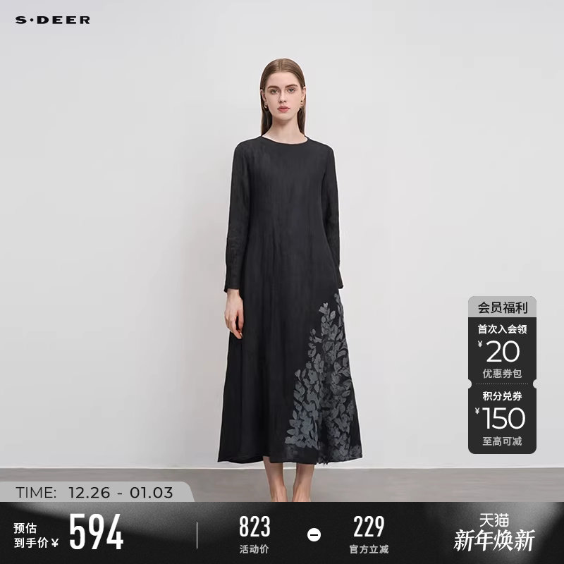 sdeer圣迪奥2025秋季女装圆领撞色亚麻长袖连衣裙S24381209