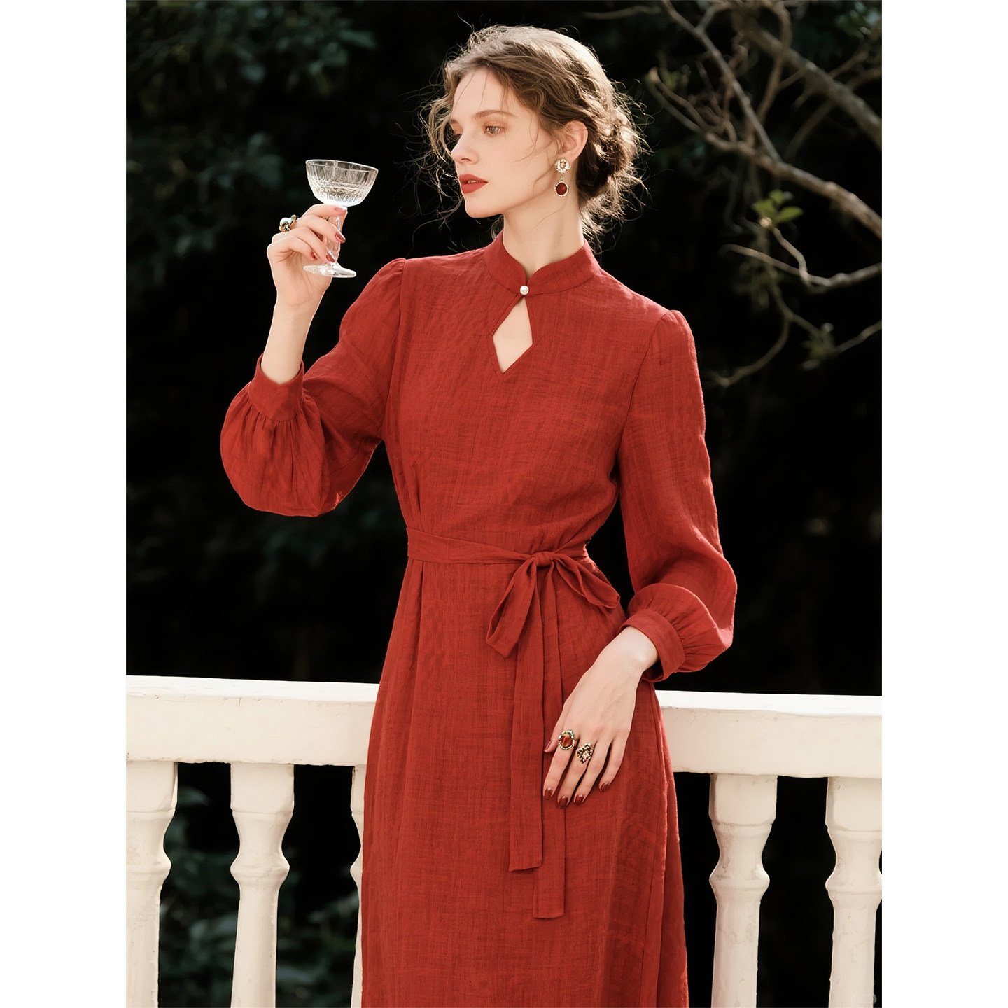 新中式立领亚麻红色长袖连衣裙女2026年春季新款高级感绑带长裙子