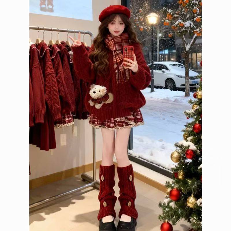 冬季圣诞好看红色毛衣针织衫女高级感遮肉格纹短款裙子穿搭一整套