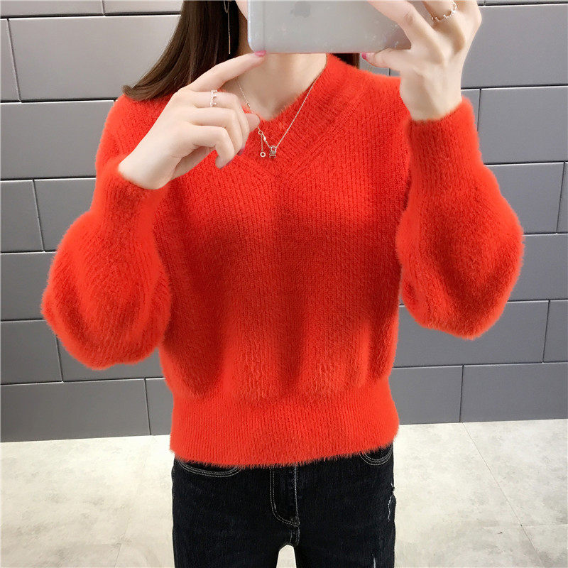 水貂绒毛衣女短款V领针织打底衫2025新款宽松洋气内搭外套潮秋冬