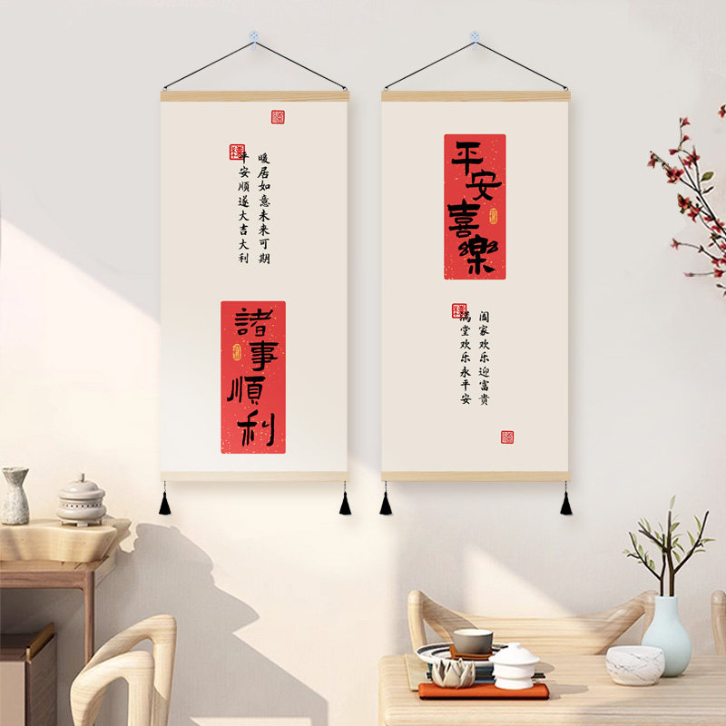 新中式玄关挂布画装饰画走廊喜庆挂画平安喜乐字画墙画好寓意壁画
