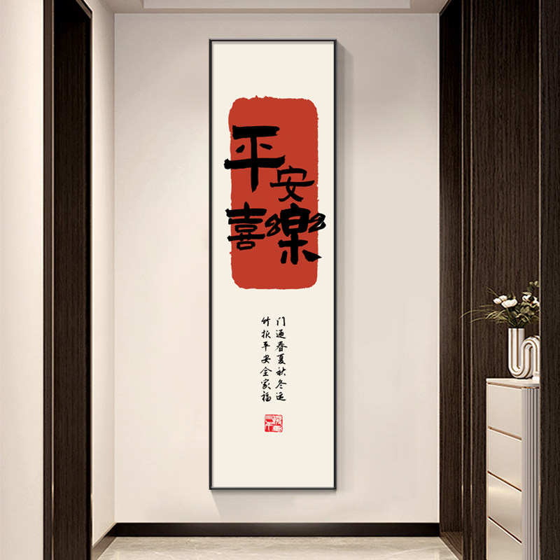 新中式入户玄关装饰画走廊过道窄长条背景墙挂画平安喜乐书法壁画