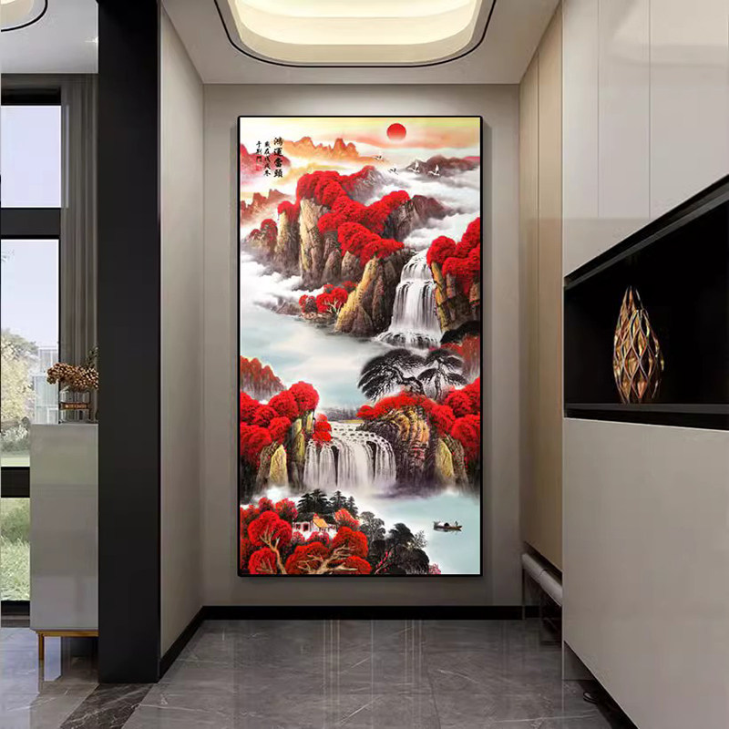 鸿运当头入户玄关装饰画走廊过道山水挂画流水生财壁画旭日东升画
