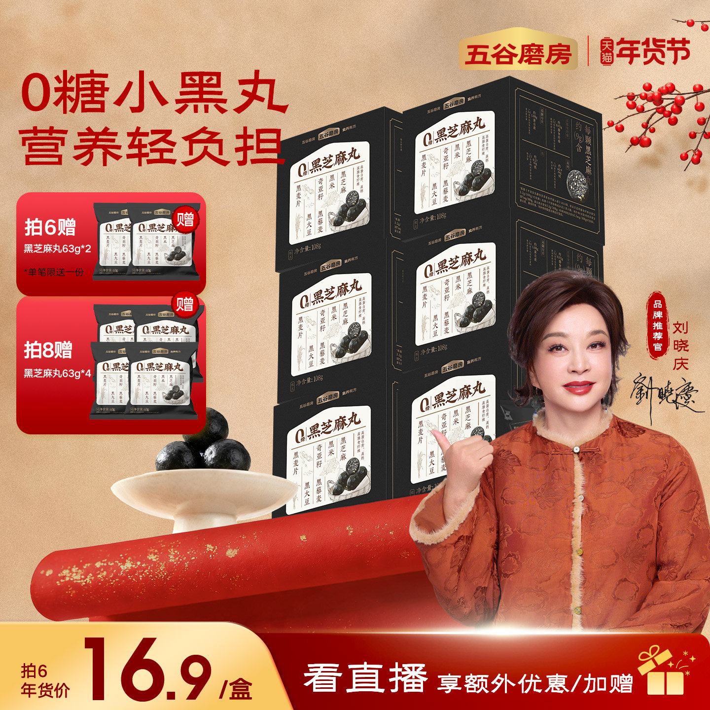 五谷磨房无糖黑芝麻丸黑之养芝麻球糕点核桃芝麻黑豆粉送长辈礼盒