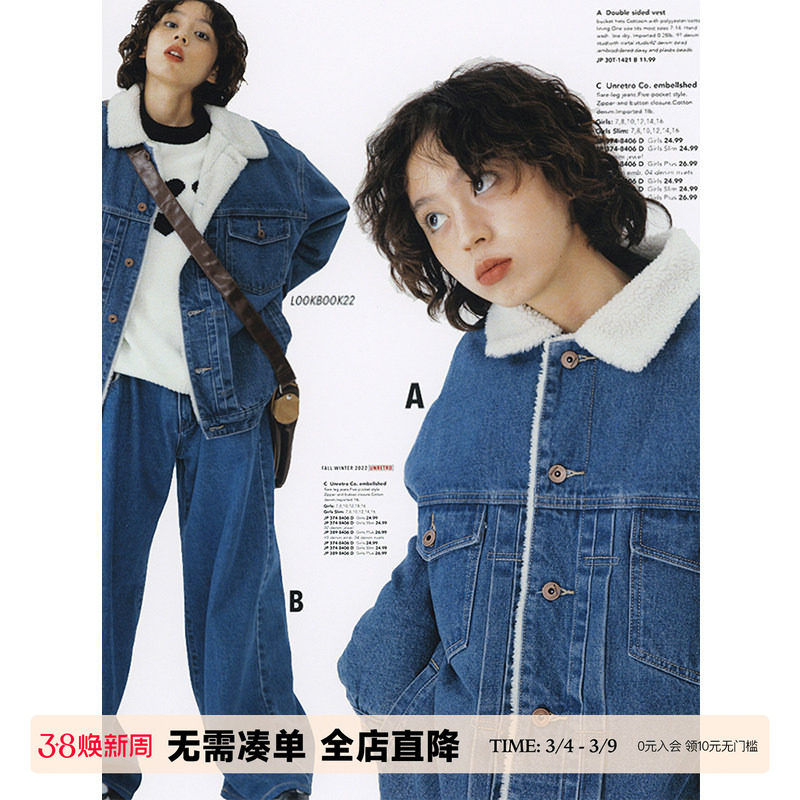 UNRETRO 复古蓝色羊羔毛内胆加绒牛仔外套女冬季新款加厚翻领棉服