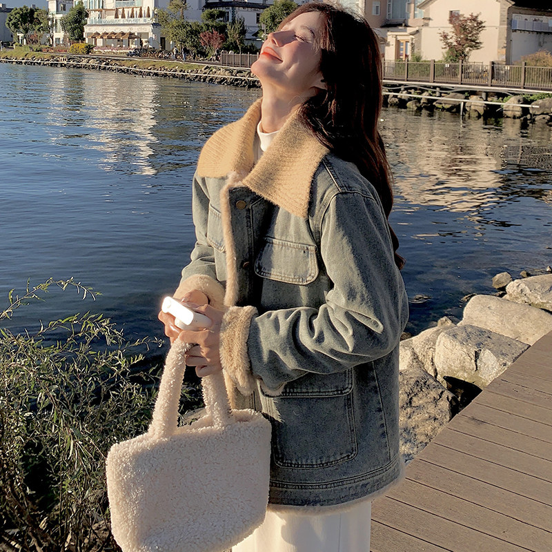 小个子文艺复古加绒牛仔外套女秋冬新款羊羔毛领宽松显瘦加厚夹克