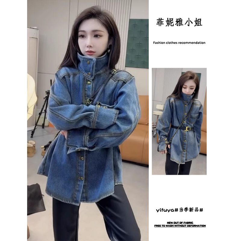 萱琪牛仔XUANQI蓝色立领加绒牛仔外套女冬韩系宽松显瘦中长款衬衫