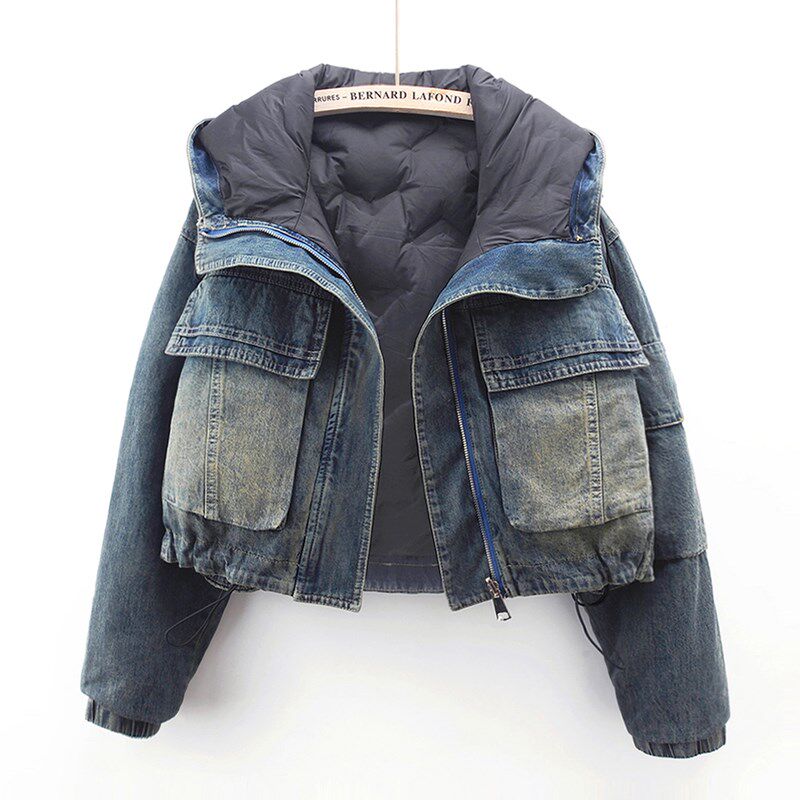 2023秋冬新款流行羽绒内胆轻薄加绒牛仔外套女短款两面穿上衣夹克