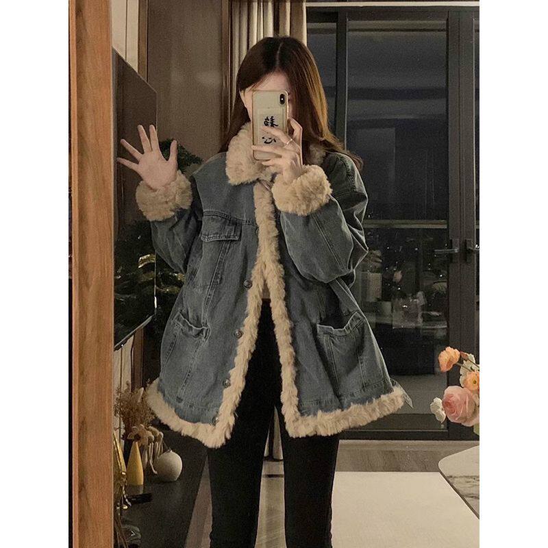 加绒牛仔外套女宽松百搭2025冬季新款羊羔毛棉衣服懒惰风加厚棉袄
