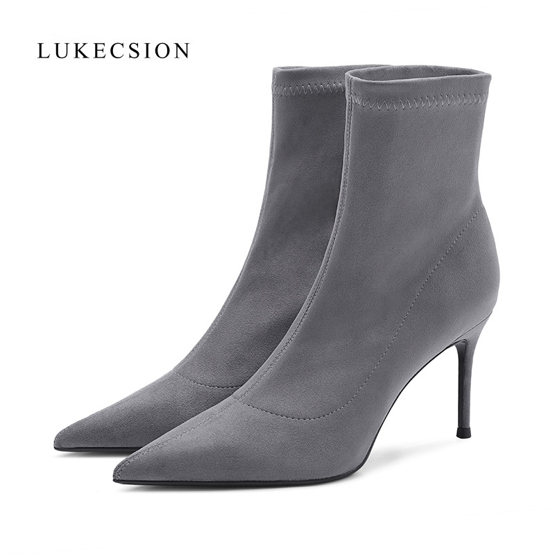 LUKE灰色高跟弹力靴女短靴秋冬季尖头百搭高跟鞋气质及踝靴瘦瘦靴
