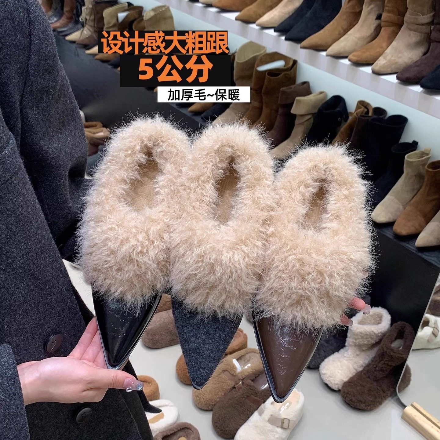 法式粗跟尖头棕色小皮鞋加绒保暖毛毛鞋女秋冬新款气质灰色高跟鞋