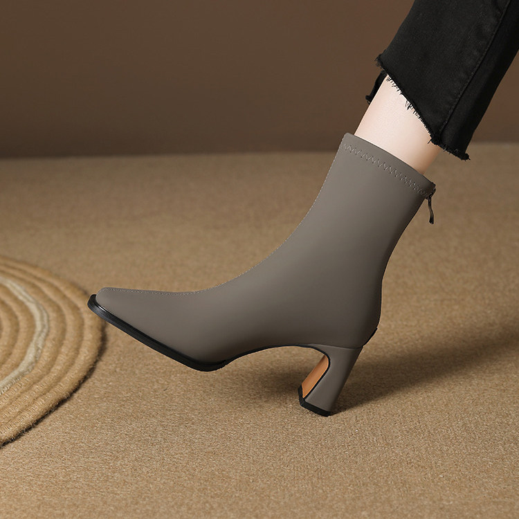 灰色短靴高跟女粗跟2025秋冬新款韩版弹力方头瘦瘦靴气质百搭靴子
