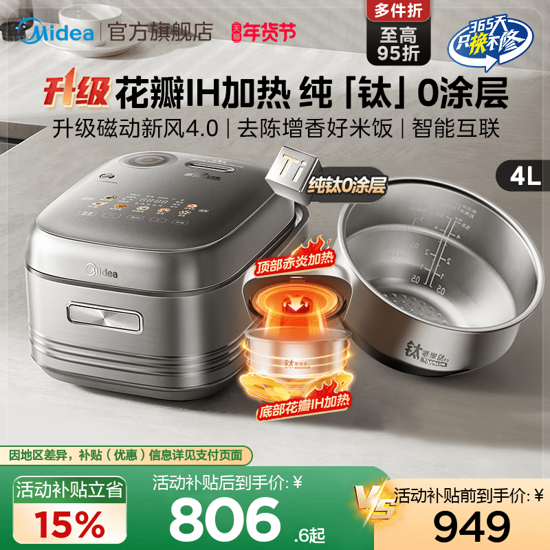 政府补贴美的花瓣ih电饭煲纯钛0涂层4L家用3-4人赤炎无涂层电饭锅