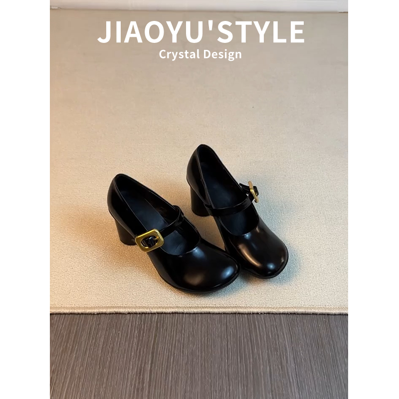 真皮~骄屿复古黑色一字带玛丽珍鞋女圆头浅口绝美高跟鞋通勤单鞋