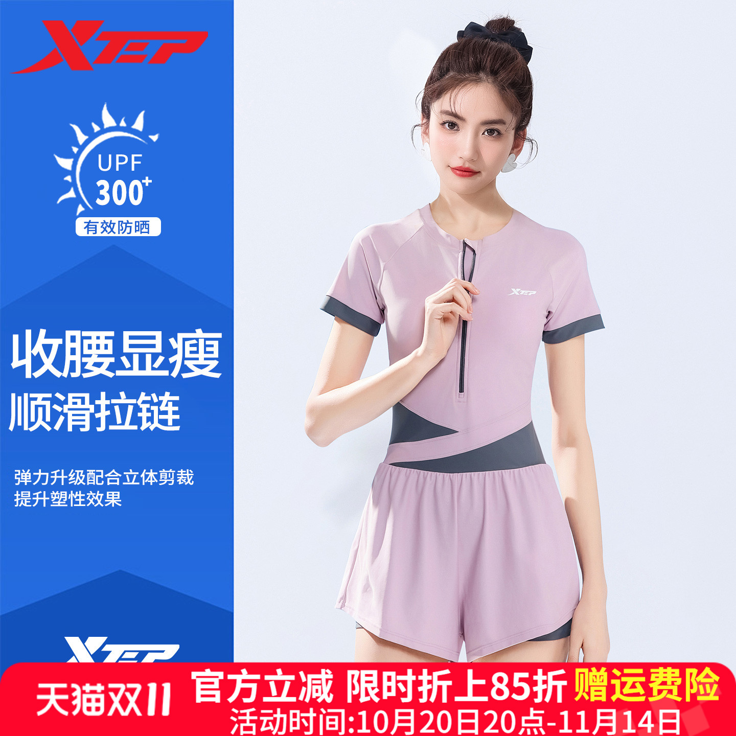 特步保守泳衣女2025年新款显瘦遮肚连体游泳馆训练专用五分沙滩装