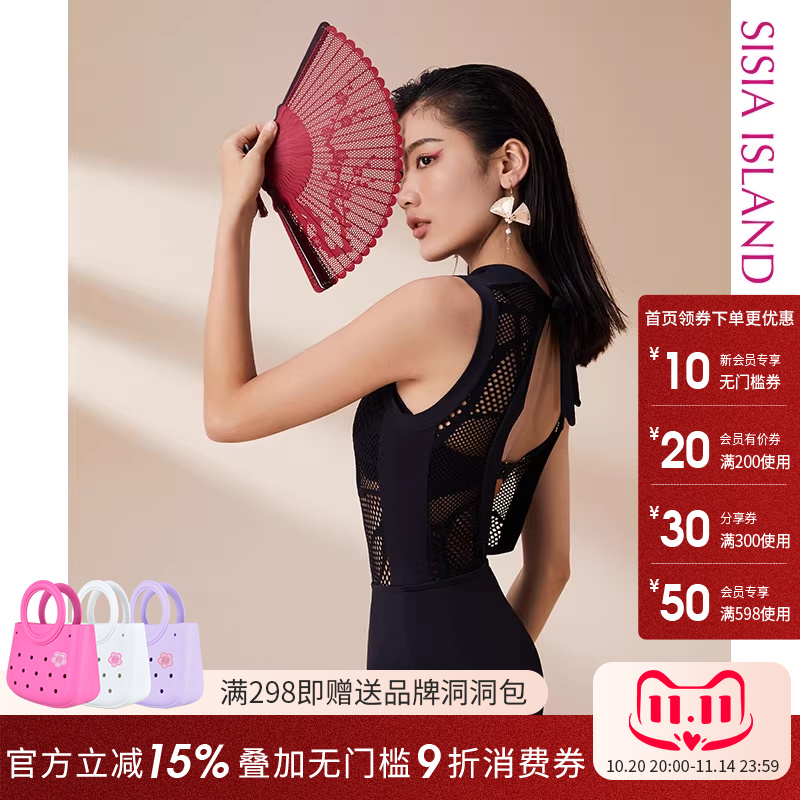 sisia泳衣女性感黑色遮肚显瘦露背连体游泳衣无袖保守泳衣女夏季