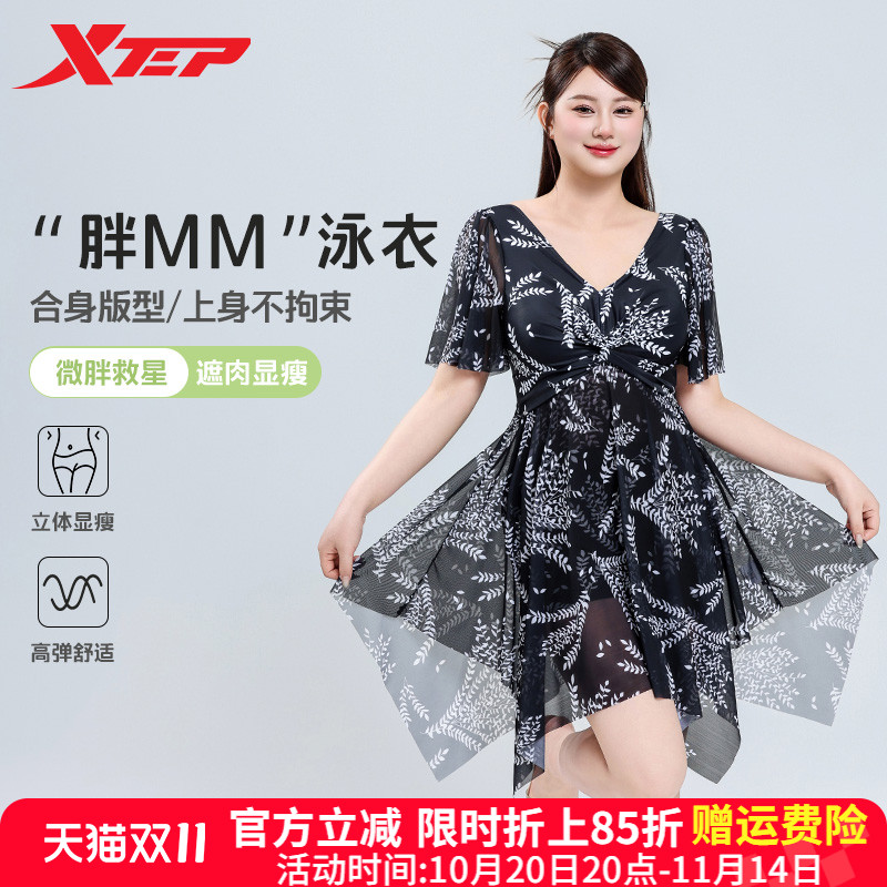 特步大码保守泳衣女2025年新款显瘦遮肚连体胖mm度假沙滩温泉泳装