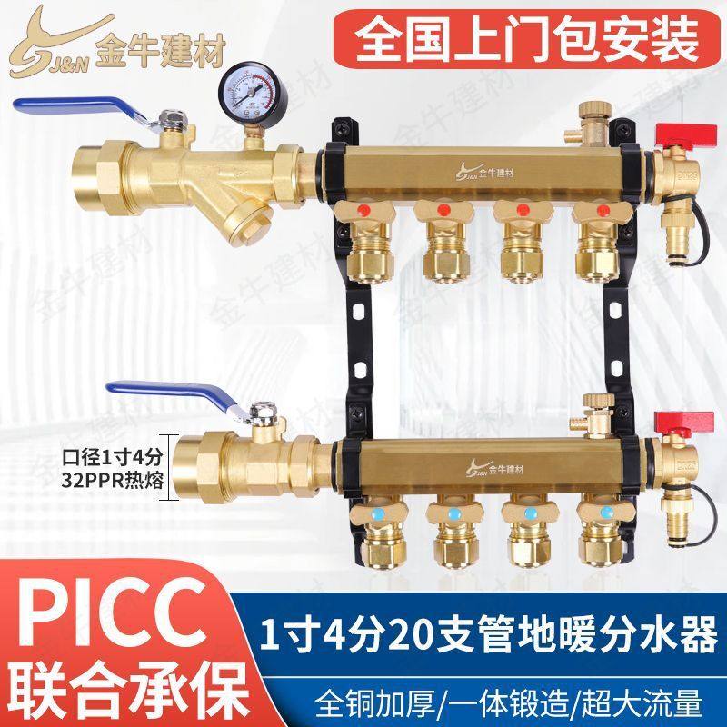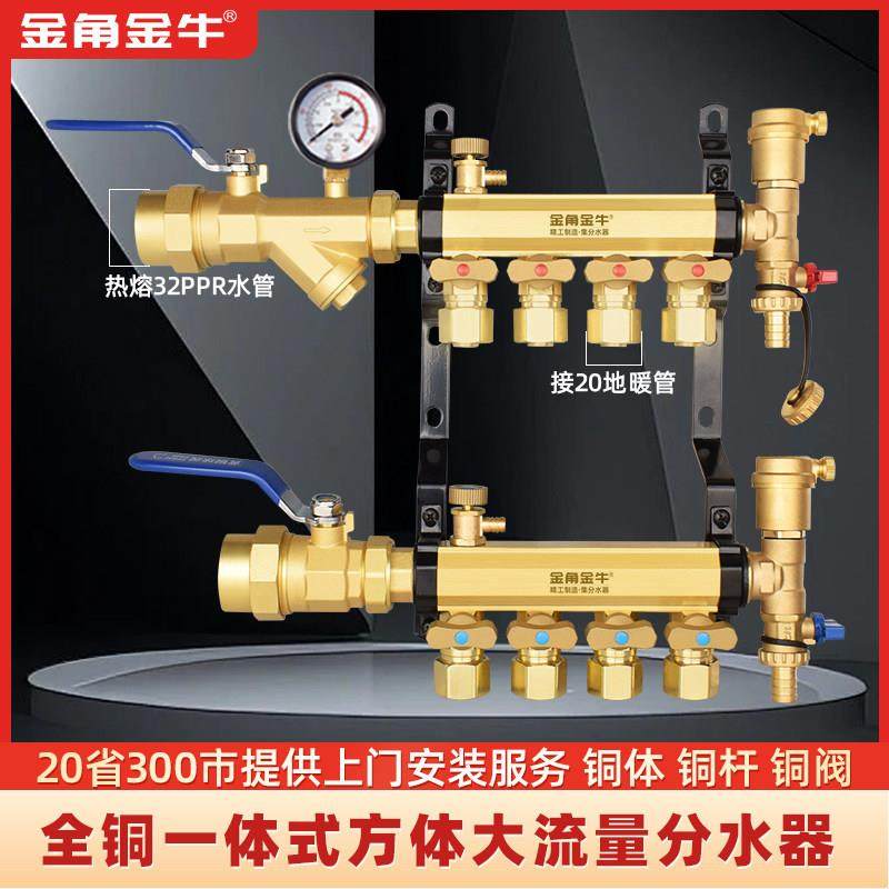 金角金牛地暖地热分水器 全铜大流量家用加厚PPR32/1寸支路20/4分