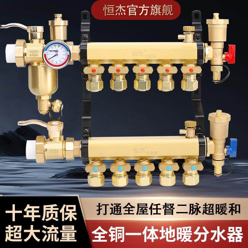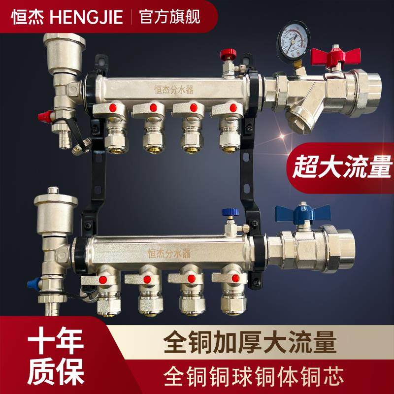 恒杰地暖分水器 大流量家用暖气345六路集水器配件全铜地热分水器