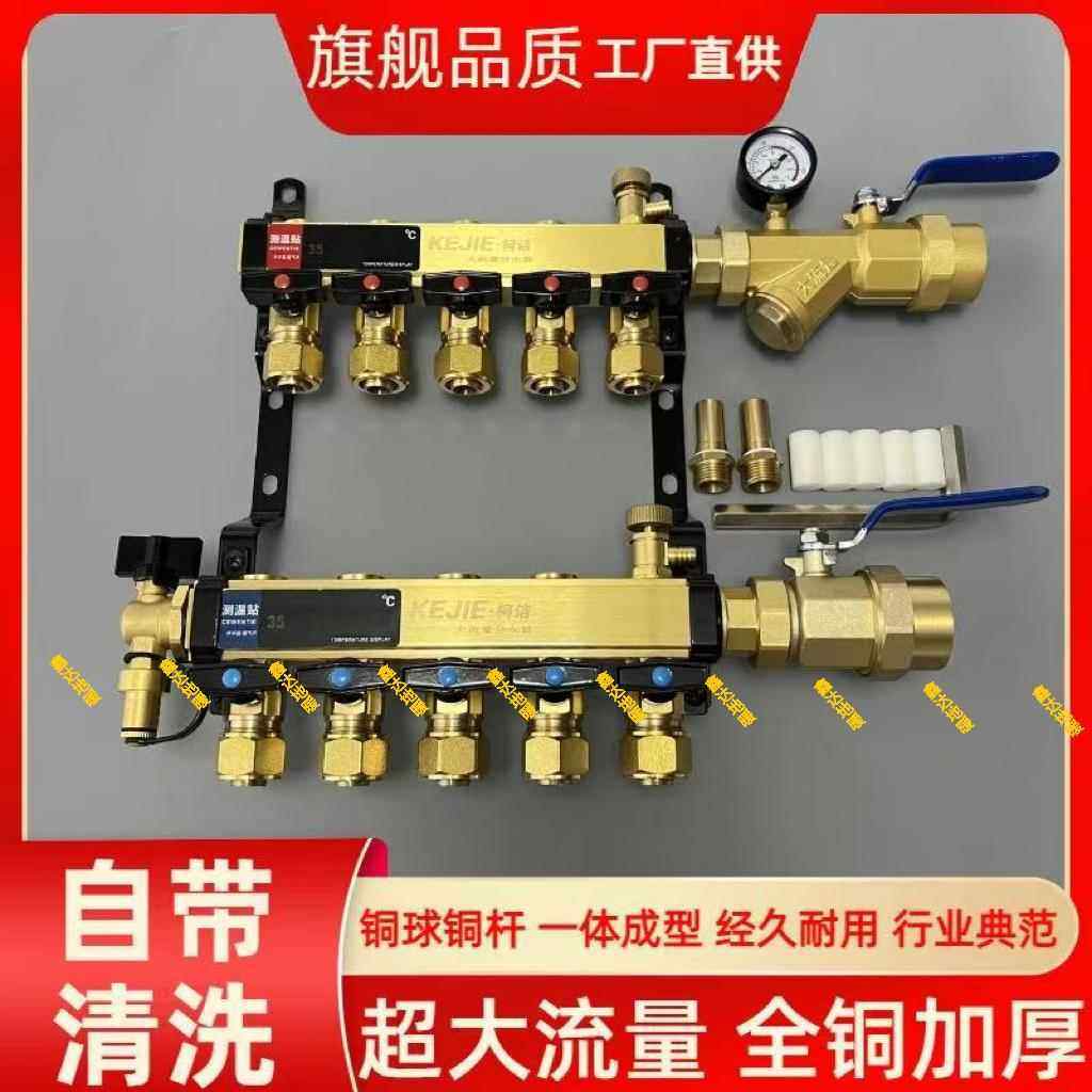 自带清洗地暖分水器全铜加厚地热分水器超大流量分水器阀门开洞款