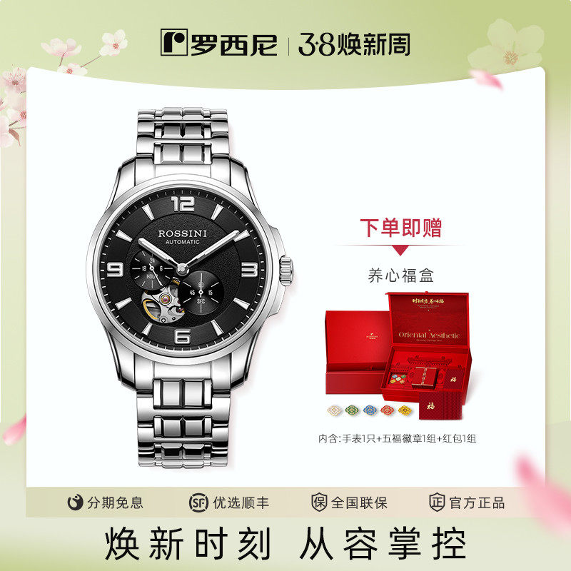 罗西尼官方手表男款正品男士机械表夜光防水商务男表礼盒5200005