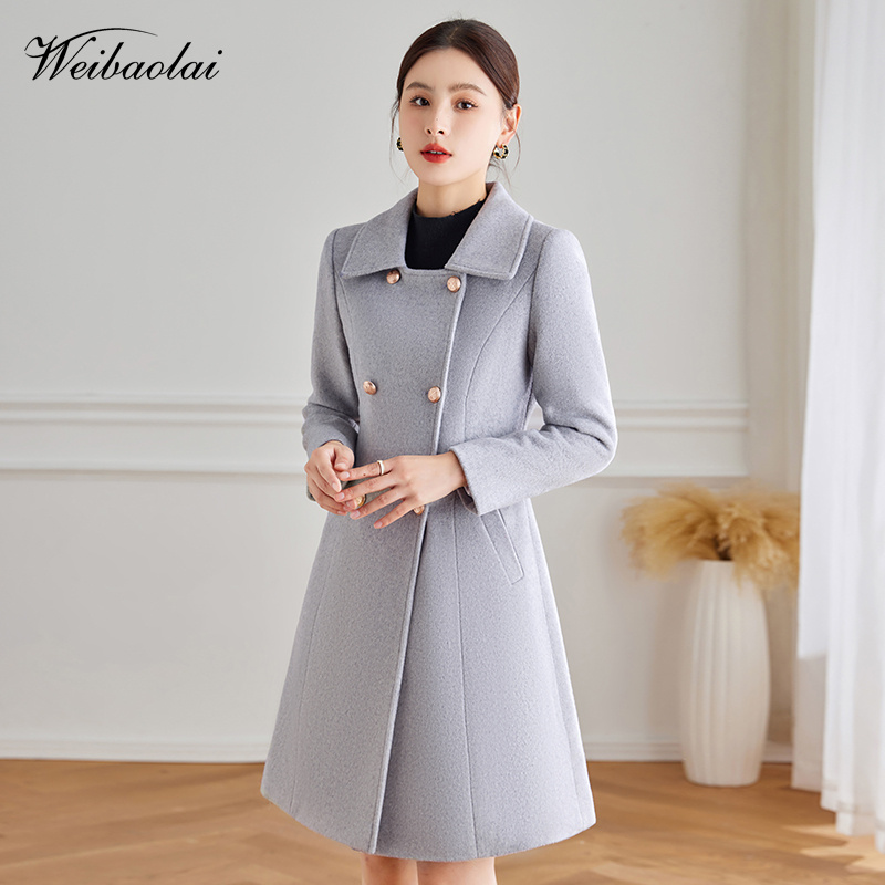 丝巾职业毛呢大衣女中长款冬气质修身双排扣珠宝店工作服呢子外套