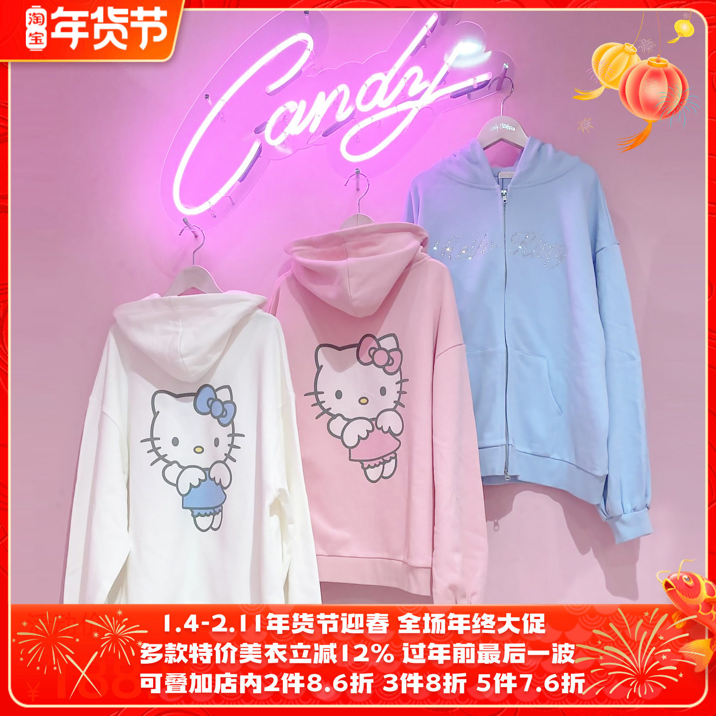 再入荷日系candy凯蒂猫合作款水钻宽松长款oversize连帽卫衣开衫